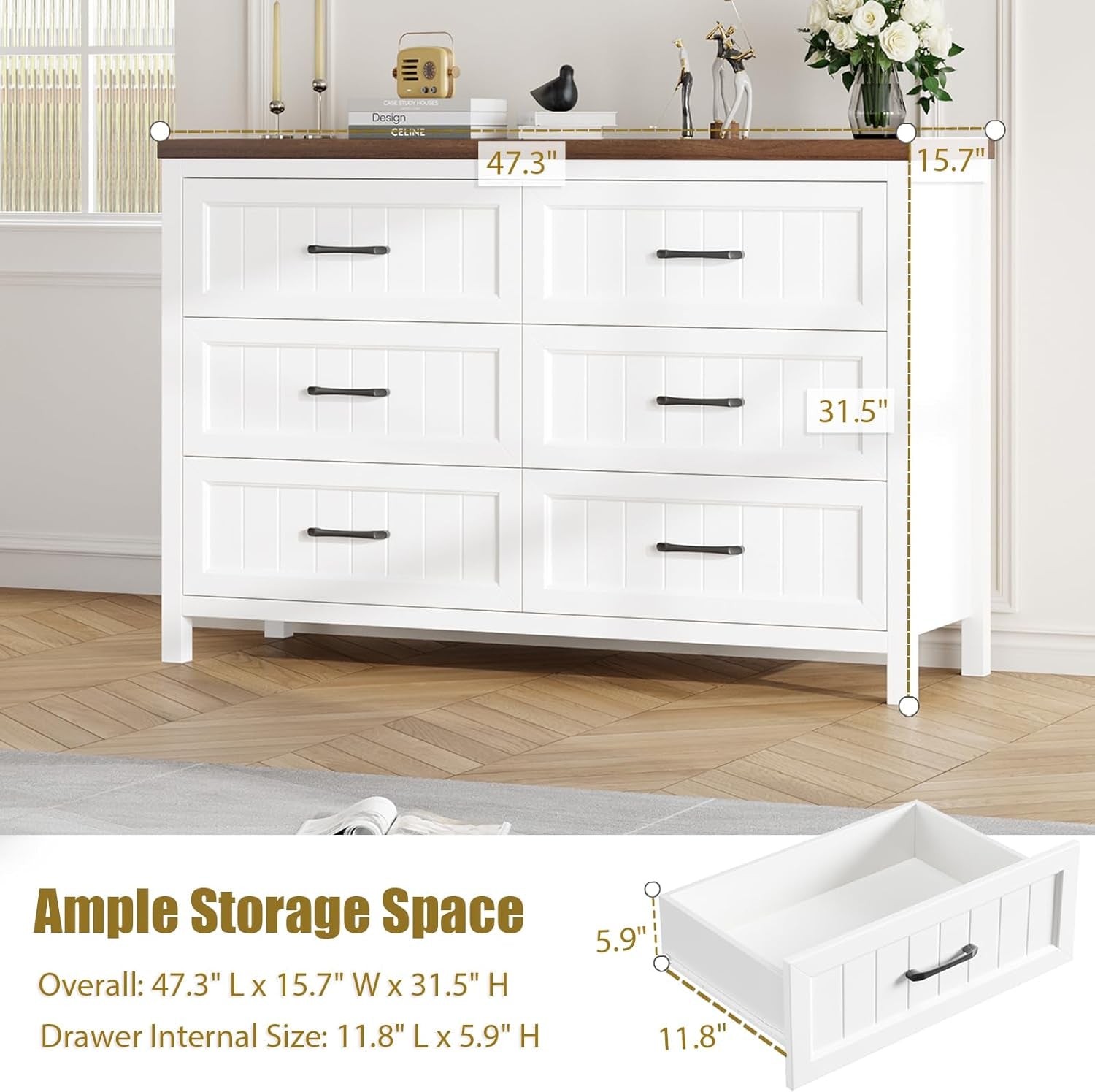 - * AMPLE STORAGE: Measuring 47.3" L x 15.7" W x 31.5" H, larger size. This farmhouse dresser features 6 spacious smooth-glide drawers, providing versatile storage to easily organize your and your family's clothes, socks or other personal items. The ample drawer space ensures items are kept sorted and easily accessible, while the spacious wooden dresser top is ideal for placing your favorite display decors, photos and lamps, keeping your space neat and tidy. Bid farewell to clutter.