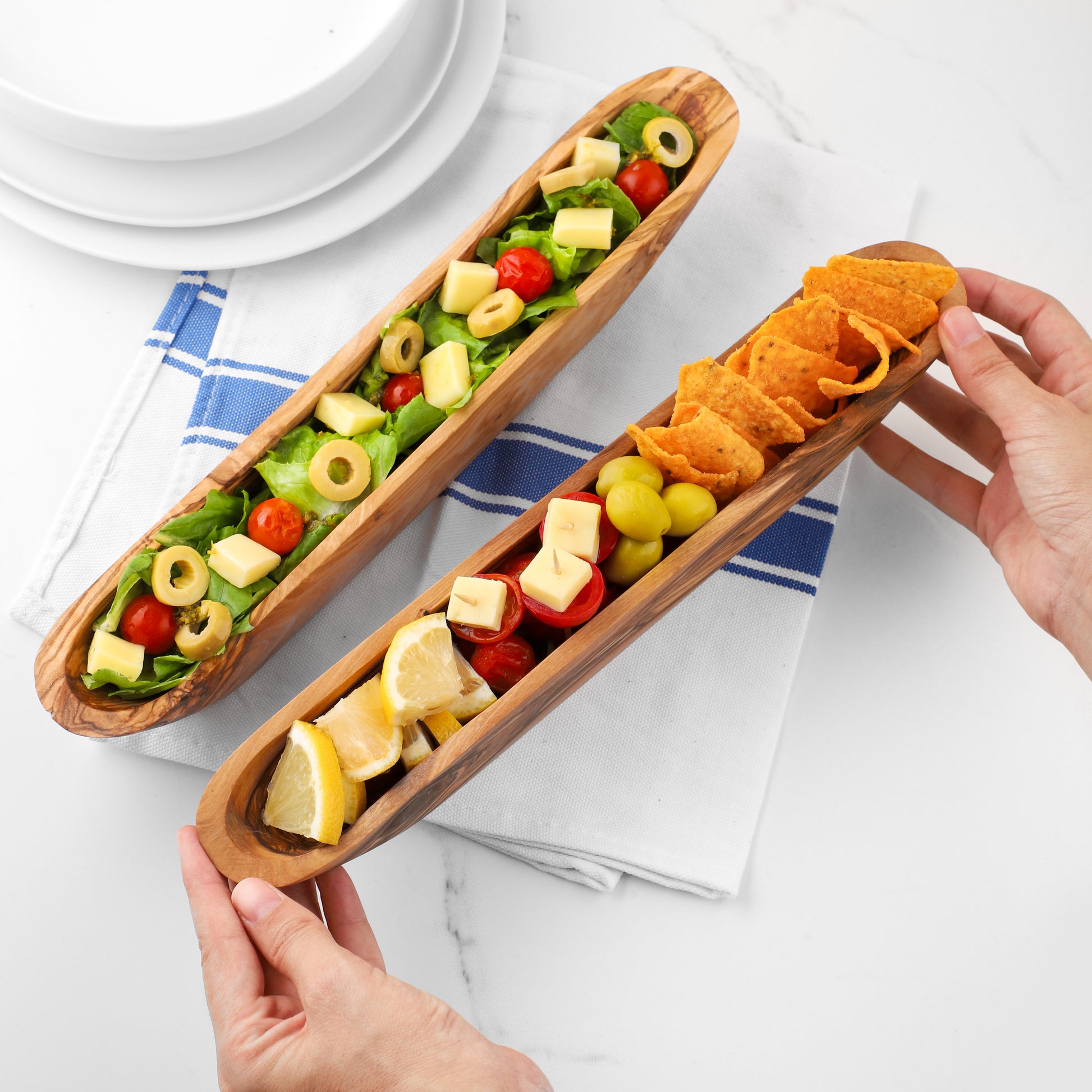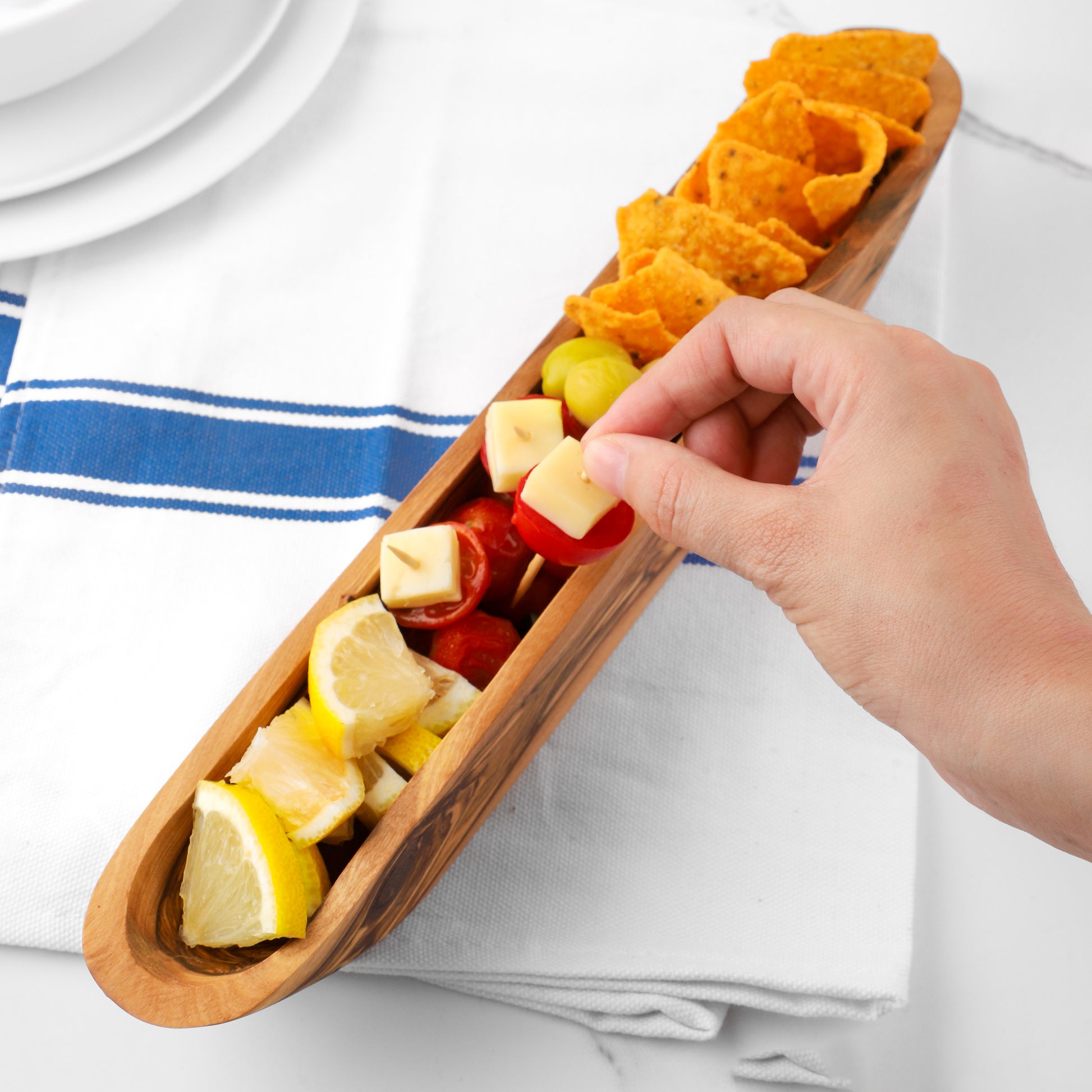It’s carved from olive wood by hand, so each one is different. Some are darker, some lighter—every tray shows off the wood’s natural lines and swirls. That little variation gives it character.